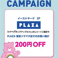 また期間中、イーストヤード2階にある「PLAZA 東京ソラマチ店」とのスペシャルキャンペーンを実施。この時期、PLAZAにもケアベア™グッズの新商品がたくさんデビューするので、カフェとPLAZAを行き来して楽しもう!