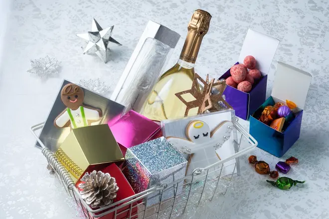 黄金色のシャンパンやホテルオリジナルのお菓子などが詰まったプレゼントにぴったりのチャリティーハンパー
