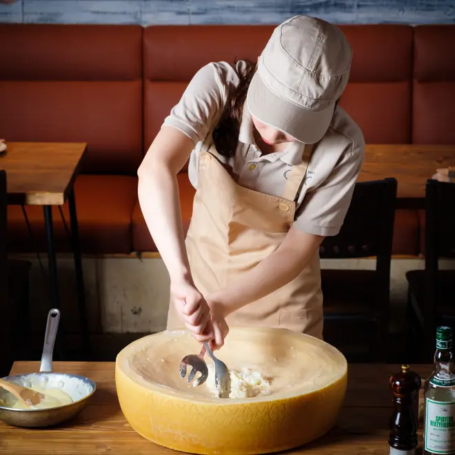 毎晩20時になると始まるチーズリゾットタイム。20kgのハードチーズ、グラナパダーノチーズをダイナミックに削りながら作るチーズリゾットはチーズ料理専門店ならでは。客席に囲まれながらチリーズリゾットを調理し、出来立てを提供する。