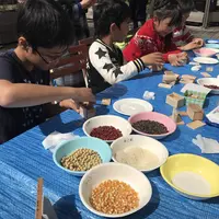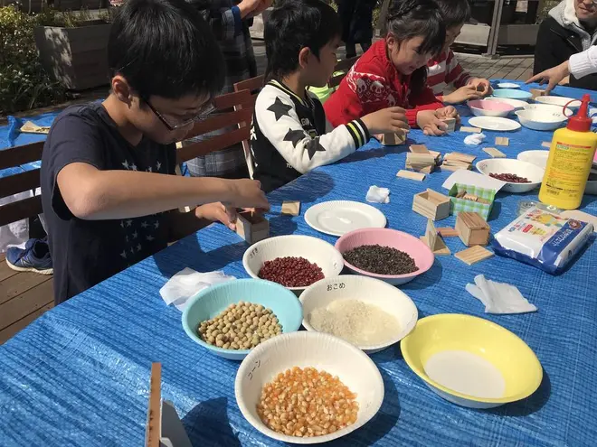 杉の端材と植物の種や豆でつくるシェイカーづくりとカスタネット作り。