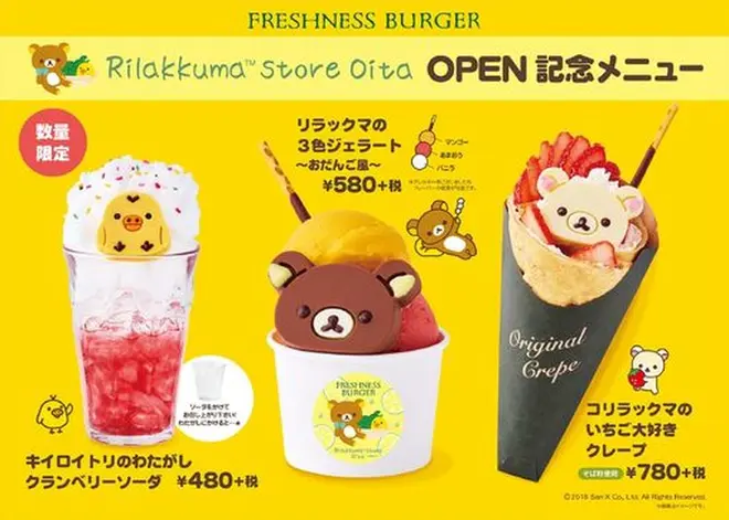 2018年3月2日(金)に「リラックマストア アミュプラザおおいた店」がオープンすることを記念して、同施設内で営業している「フレッシュネスバーガー アミュプラザおおいた店」が連動企画を行うこととなり、リラックマの登場キャラクターに合わせたスイーツとドリンクの3商品を販売する。キュートにおいしく仕上がったコラボレーション商品を楽しむことができる。