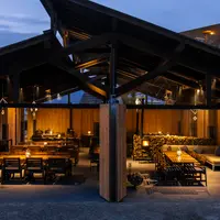 1万坪の森のガーデンの中にある、森とリルのBBQフィールドは、夜になると幻想的な照明演出が広がる。開放的な半屋内型のBBQスペースには、薪ストーブが設置され、都会とは思えない自然体験ができる。
