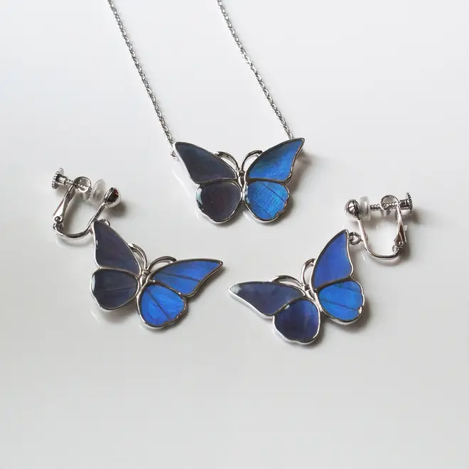 モルフォ蝶のはねシルバーイヤリング 28,080円、ペンダント 8,640円