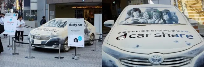 「日常の中で車を使っていない時間、すなわち車がホコリをかぶっている時間をマイカーシェアに登録することで有効活用できる」、というサービスを訴求するため、このグラフィックアートを展示するに至った。