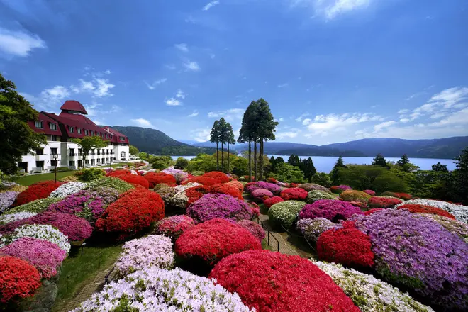 今や箱根の初夏の風物詩ともなっている“小田急 山のホテル”のツツジ。5月の連休頃になると、箱根・芦ノ湖畔に建つホテルの広大な庭園には色とりどりのツツジが咲き始め、富士山や芦ノ湖をバックに絢爛たる景色が広がる。