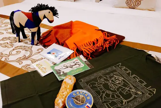 馬の人形、カシミヤのストール、モンゴリアンのTシャツ、メッセージカードを購入。