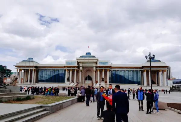 旧チンギスハーン広場。市の中心にあり、宮殿の前面に、台座に座る大きなチンギスハーン像が建てられている。