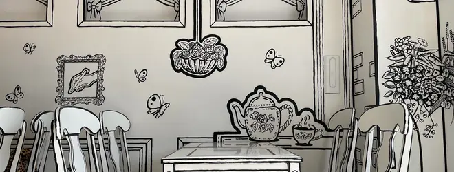 モノクロの絵本の中に飛び込んだかのような内装が魅力の2Dカフェ。
