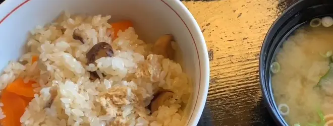 「蒜山おこわ」餅米に鶏肉や椎茸、人参、油揚げなどの材料をふんだん使ったおこわ。祭りや祝事の時に登場する蒜山を代表する郷土料理🍚
