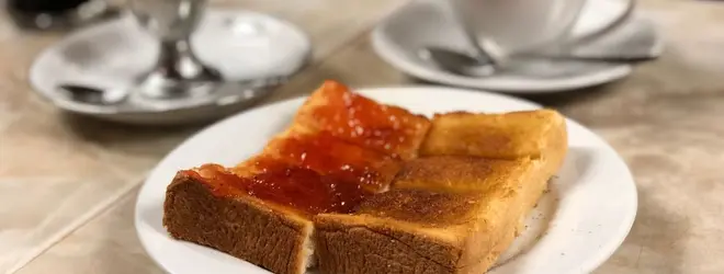 築地場内にある老舗の喫茶店で朝ごはん。メニューはドリンクとトースト、半熟ゆで卵のみ。トーストはデフォルトで全面バターと半分イチゴジャムの組み合わせ。お好みで塗り方や焼き方をカスタマイズできますよ〜!