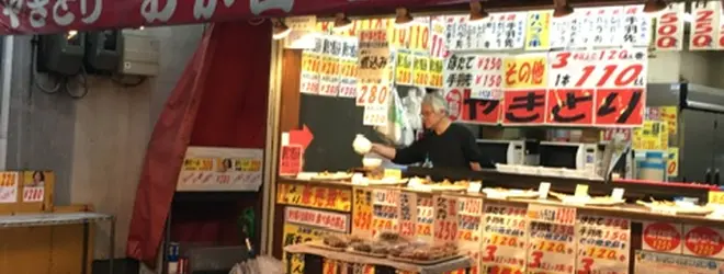 激安の焼き鳥店。店頭に並んでいる焼き鳥のなかから食べたい串をトレーに乗せていき、トレーごと渡してお会計するスタイルで、その場でさくっと美味い焼き鳥が味わえます