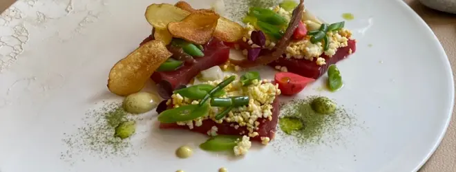 「レストランひらまつ」で10年間働いた伊藤良明シェフが2016年9月にオープンしてわずか5ヶ月でミシュラン一つ星を獲得し、今も守り続けている人気店「L’Archeste(ラルケスト)」。伊藤シェフは常に食材にこだわり、生産者とのつながりに重きを置いており、素材の素晴らしさを教えてくれる料理を提供しています。日仏友好160周年の際には、現天皇陛下や安倍元総理夫婦も来店したという功績も。店名はアーティスト、職人、オーケストラ、アートを組み合わせた造語です。ランチは3皿で60ユーロ。