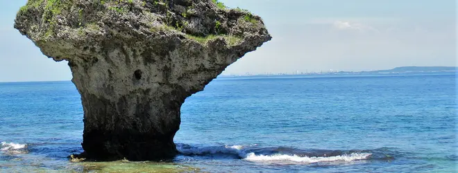 「花瓶岩」と呼ばれる由来は、サンゴ礁の化石の岩が、長年の波の浸蝕によってこのような形となり、岩の上部に緑の草が生え、まるで花瓶のように見えるから。