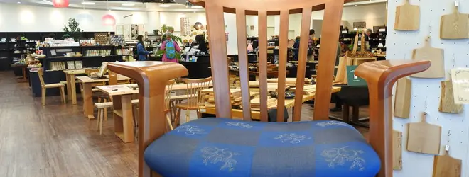 カフェの併設、ではなくカフェが併設されている飛騨伝統工芸と伝統家具のお店。そこらのお土産屋さんには見掛けないハイセンスで面白い工芸品や一生モノの家具が揃っています。ちなみにお値段もハイセンスになります。入口近くの2人軽く座れる巨大椅子は実際に座って撮影OK。