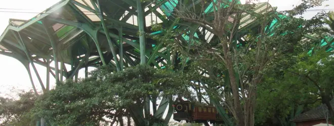 写真では見にくいと思いますが、公園内には緑色のデザイン建築があり、その下には機関車、客車のオブジェが吊られた形で連なっていて、機関車からは男の子と女の子が笑顔で手を振っています。