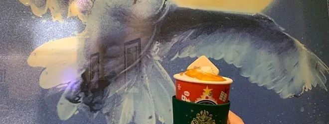 フクロウ便のツリーのあるトーチパークのある常盤橋タワーのB1階にあるタリーズでは、ハリポタコラボのラテや、ホグワーツから飛び立つヘドウィッグと一緒に記念撮影のできるフォトスポットが。