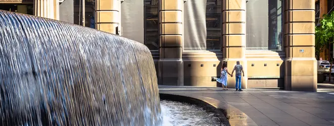 パート1でモーフィアスがネオにマトリックスのシステムを教えている最中、赤いドレスの女性とすれ違う噴水はここ「マーティン・プレイス」の中央にあります。