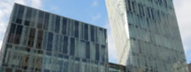 2棟だてのビルで、高層棟は斜めにそびえるような外観をしている。両棟とも夜はLEDによりライトアップされます。