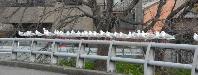 この場所、海から4キロ以上入った場所で、周囲は全て住宅街なのです。しかもその橋も頻繁に人や車が通る道で、見ている間にも車は通る自転車や人も通るのに関わらず、欄干に綺麗に並んでいます。カモメたちが居るのはこの橋だけです。一体何があるというのでしょうか。