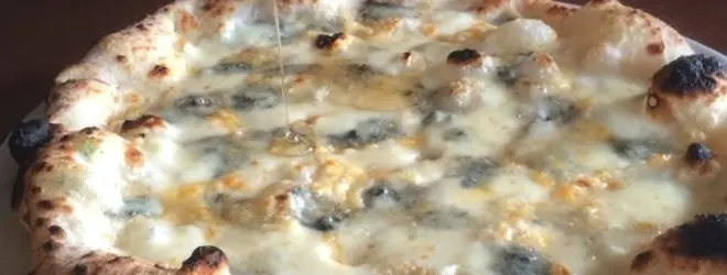 「クアトロフォルマッジ」。どのピザもおいしいのですが、ここのクアトロフォルマッジは最高なので、大勢で行って数種類のピザを頼び、その中の1つに加えるとよいです。平日はサラダとコーヒー/紅茶つき。通称、2階のピザ。