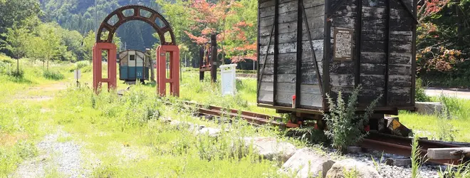県道75号沿いに短い線路と ガッタンゴーの自転車が展示してあります
