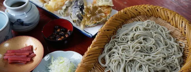 名物のへぎそば(海藻を使った蕎麦をヘギといわれる器に盛り付けた切り蕎麦)と山菜のてんぷらをいただくことができます。広い店内なので大人数での利用も可能です。