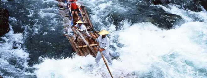 おくとろ温泉 となりの観光センターで受付。筏師の見事な櫂さばきのもと、スリルを楽しめます。