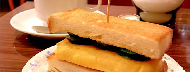 もうひとつはこんがり焼かれたトーストパンにふわっふわのだし巻き卵がサンドされた「上玉子サンド」。こちらはボリュームがあるためか、上から串がさされている個性的な見た目。雑誌で取り上げられているのをよく見かけます。