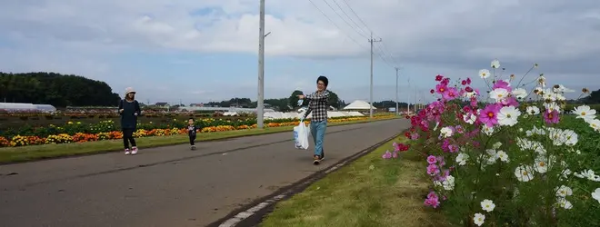 畑作地帯である上籠谷町。 コスモスやマリーゴールド、キバナコスモスがあぜ道に。 10月には「清南大地 食の祭典」が開催される。