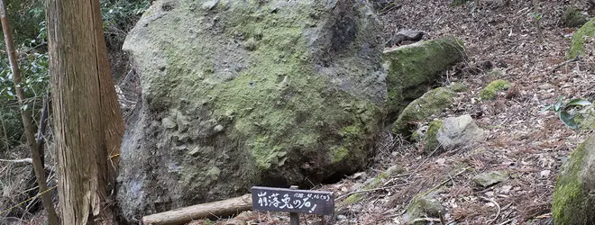 地元ガイドと、熊本地震で落ちた免の石と、免の石がもともと留まっていた大岩の裂け目を訪れます。