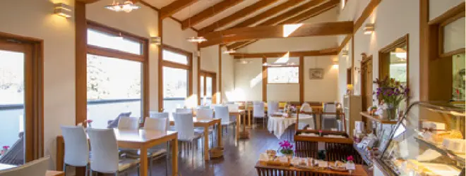 黒川温泉の手前にある高台に建つスイーツカフェ。オープンキッチンで作られる九州産の素材を活かした生菓子、焼菓子は約20種類。また、店内奥の壁際に並 べられている座面の大きな椅子は、赤ちゃんを寝かすのにも便利と評判。
