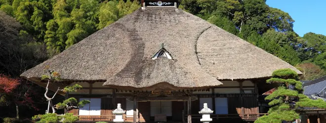 9世紀創建とされる古刹。お寺は茅葺き屋根の趣ある佇まい。数年前に葺き替えたので新しく見えますが実は歴史があります。お寺の裏に33体の観音像が点在しており、山歩きを楽しみながら見て歩くことができます。