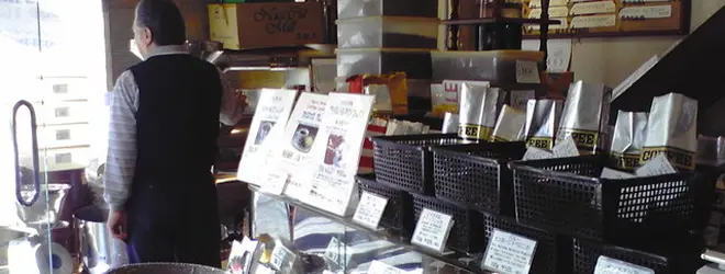 南口商店街中程にある老舗の豆屋さん。おじさんが店頭で豆を焙煎しています!