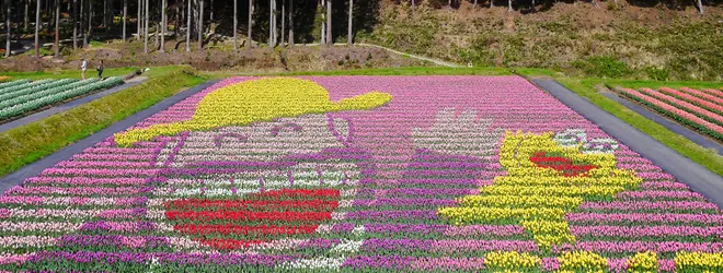 毎年4月中旬から下旬に行われる但東チューリップ祭りです。2017年度は明治のカールおじさんでした。お祭りのメインイベントであるチューリップアートですが、2015年度は、クレヨンしんちゃんだったんですよ