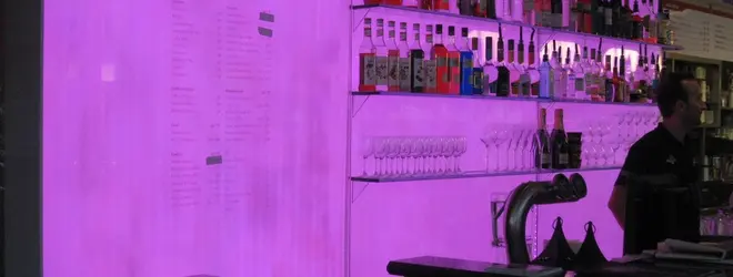 公園のすぐ近くにあるカフェは、店内のLED壁がすごく目を引きました。