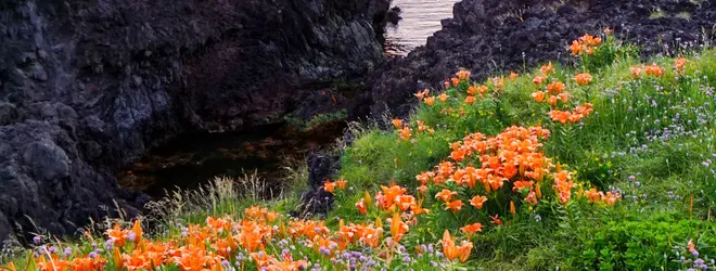 看板も駐車場もないけれど、岩ユリの時期には多くのカメラマンを魅了してやまない小田の岩ユリと海のコラボレーション。