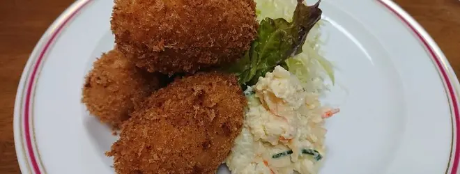 出てきた味噌汁の大きさに驚く五郎さん。ちくわや半熟卵が入っているのをふうふうしながら頂きます。熱々コロッケとフライはカニとじゃがいもで、五郎さんの好みど真ん中だったようです。