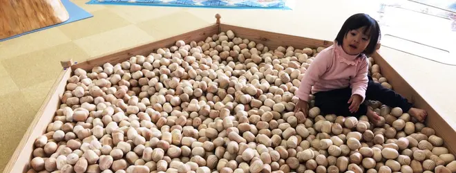 樹齢100年の小国杉を磨いて作ったすべり台、小国杉で作った木のプール、他にも木のおもちゃや絵本もたくさんあり、とっても贅沢な遊び場だと思います。