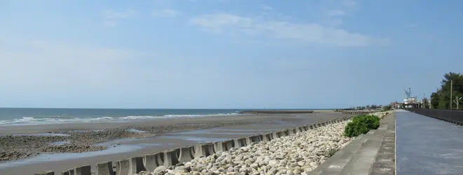 「新埔駅」から徒歩約3分のところにある「海岸觀景區」。 堤防の上が整備されていて、その堤防を少し歩きながら目の前に広がる海を望むことができます。 夕刻は、夕陽がきれいな場所としても知られてて、干潮時は砂遊びも出来るところです。