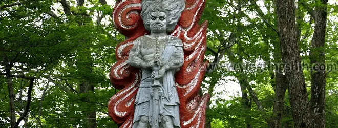 真っ赤に燃え盛る炎を背に険しい表情で立つ不動明王。
