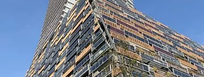 2015年に完成。豊島区の財政は流入層の低所得もあって不安視されていて、老朽化の進む区庁舎の建て替えはなかなか難しい状況でした。そこで日の出小学校跡地を含む市街地再開発事業と現庁舎地の活用による日本初の上層部マンション一体型の新庁舎が企画されました。設計を日本設計が担当し、外観デザイン監修を隈研吾事務所、ランドスケープデザインをランドスケープ・プラスが担当した建物となっています。「自然と建物の共存」というコンセプトのもと、高層ビルでありながらも、主張しすぎない建物を目指して設計されたようです。隈研吾事務所はファサード得意ですね。