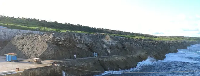 南大東島へのアクセス方法は空路(RAC)と船があります。飛行機を使えば那覇空港から1時間程度で行けるのですが、船だと約15時間(その日の天候等に大きく左右される)の道のり。平たい島影がどんどん迫ってくる感じがたまらない〜