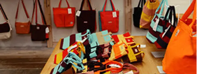 尾道帆布をつかったポーチ、トートバッグ、リュックなどなどたくさんの商品が並んでいます。