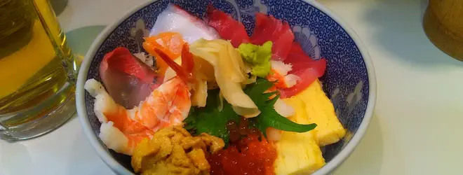 海の幸を沢山盛込んだ海鮮丼は一番の人気で、生ビールと一緒にいただく。