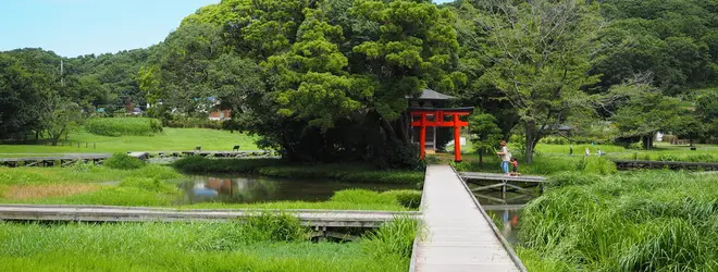 広い湿性公園のド真ん中には、朱色の鳥居があって緑の景色と朱色のコラボが素敵です。