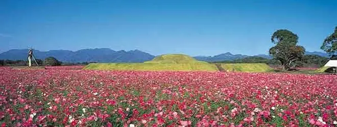 4世紀から7世紀頃に築造されたとされる300基以上の古墳からなる全国有数の古墳群。秋には300万本のコスモスが咲き誇ります。