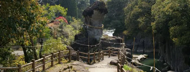 夫婦岩とも呼ばれる2つの奇岩は、霧島の噴火で堆積した溶結凝灰岩を川の流れが削ってできた、全国でも珍しい自然の妙技と言える造形です。「よろず生産の神」「子宝の神」として知られています。