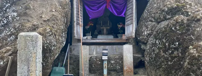 吉崎御坊近くにゴツゴツした岩が…よく見ると、その穴部分に様々な仏さまが祀られていました。