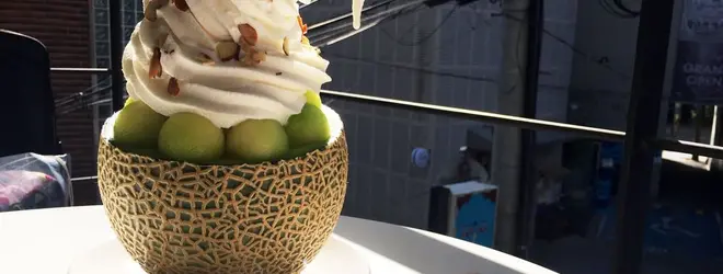 メロンをくりぬいて、その上に巨大アイスクリームというなんとも斬新なスイーツが食べられます!かなりのボリュームなのでシェアするのが◎ 味は間違いありません。