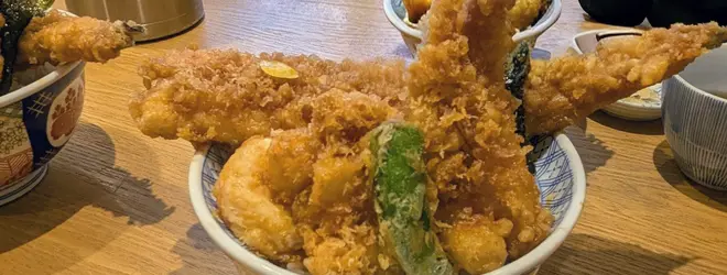 ごま油でカリッと揚げて、甘辛いタレが絡んだ美味しい天丼。